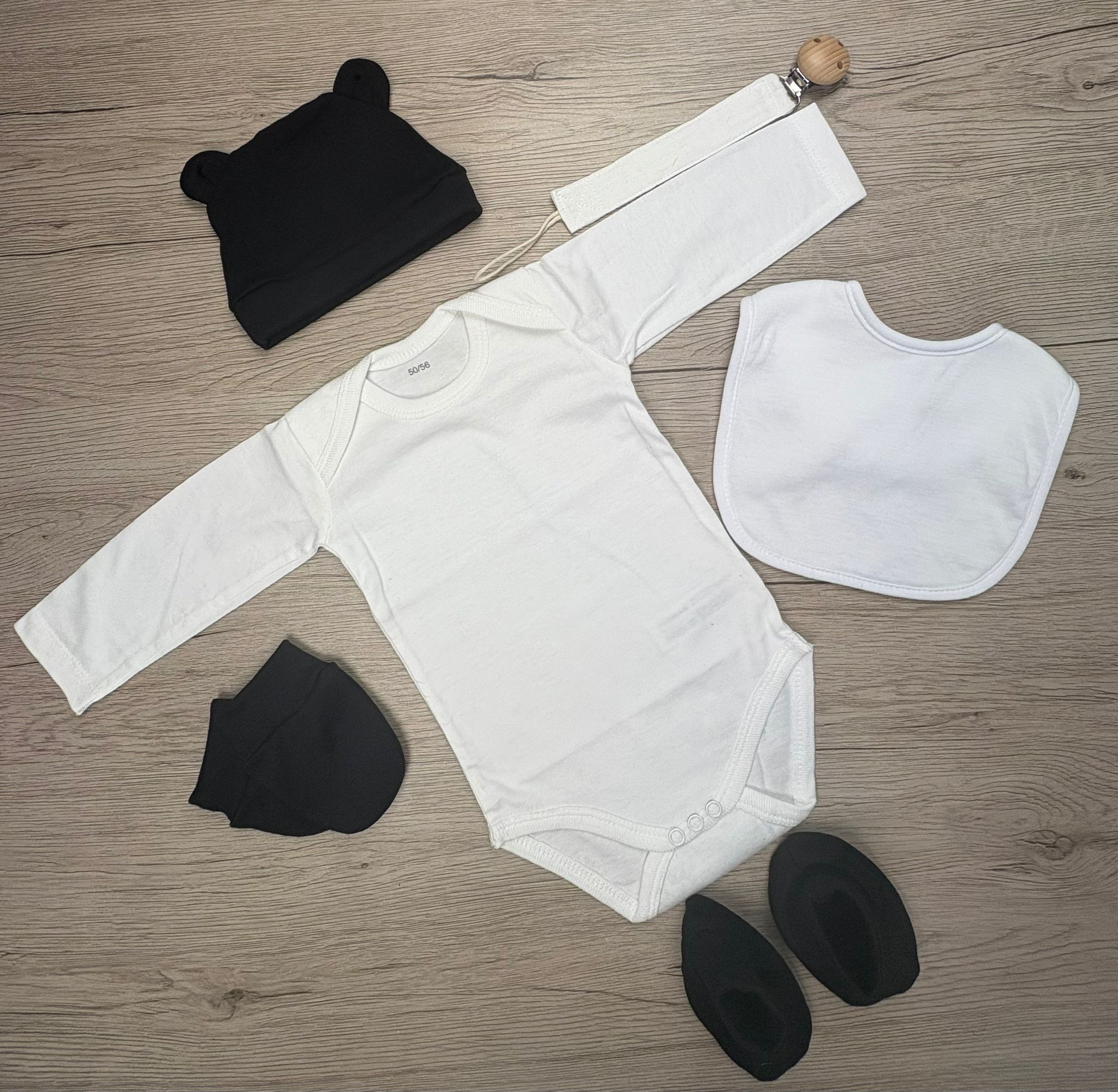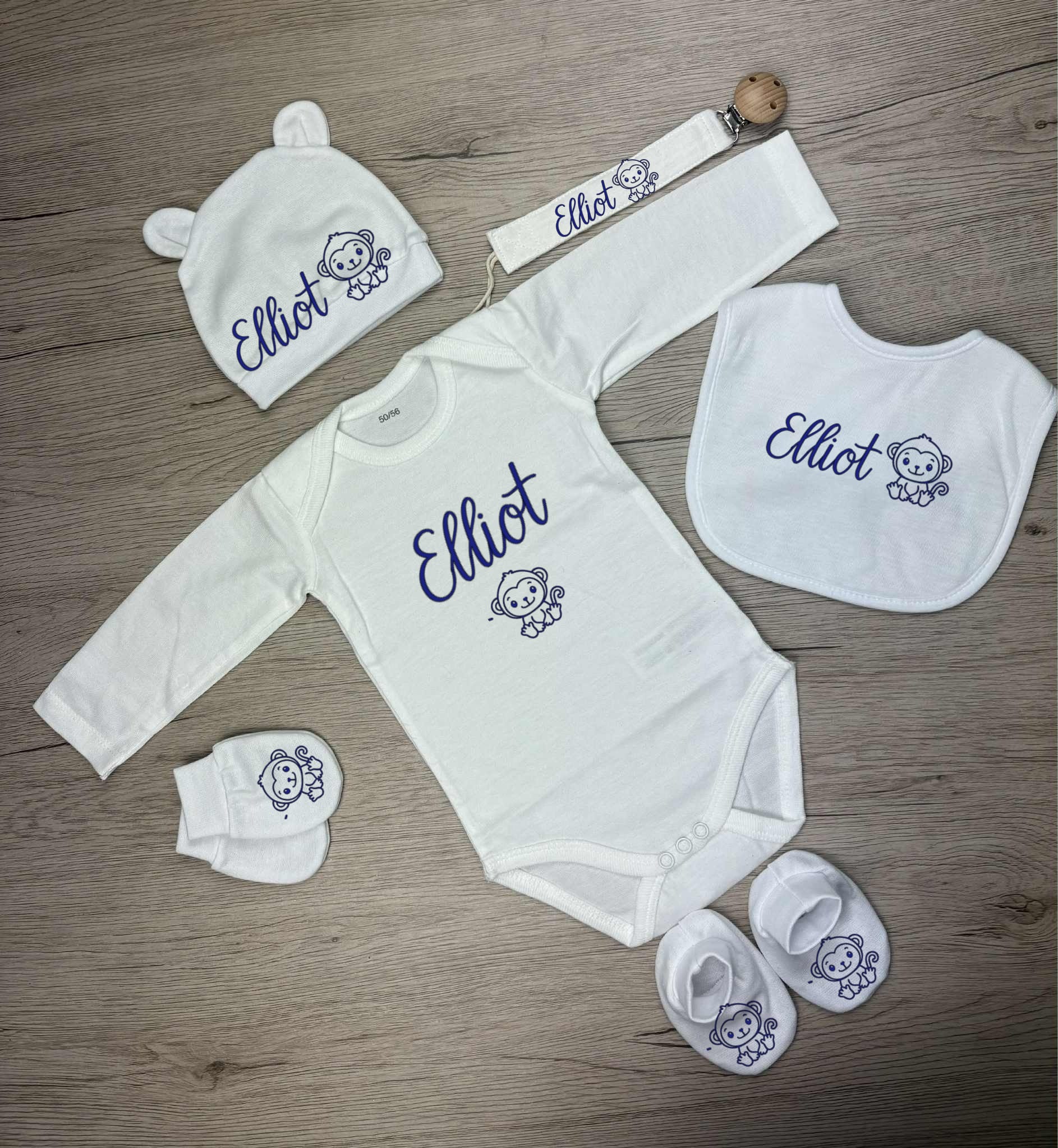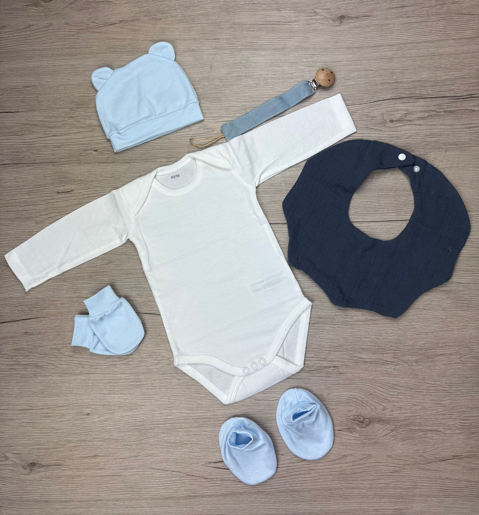 Notre box naissance personnalisée contient trois essentiels pour les tout premiers jours : un bavoir, une attache sucette, un body, un bonnet, une paire de mouffles, et de chaussons assortis. Chaque pièce est confectionnée avec des matières douces et confortables, pensées pour la peau délicate des nouveau-nés.