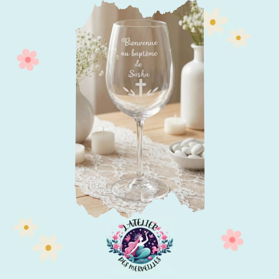 Une personnalisation délicate Ce verre à vin, aux courbes classiques et élégantes, est conçu pour accueillir une gravure de haute précision. Personnalisé avec le prénom de l’enfant (et la date du baptême si vous le souhaitez), il transforme chaque gorgée en un hommage à cette journée spéciale.